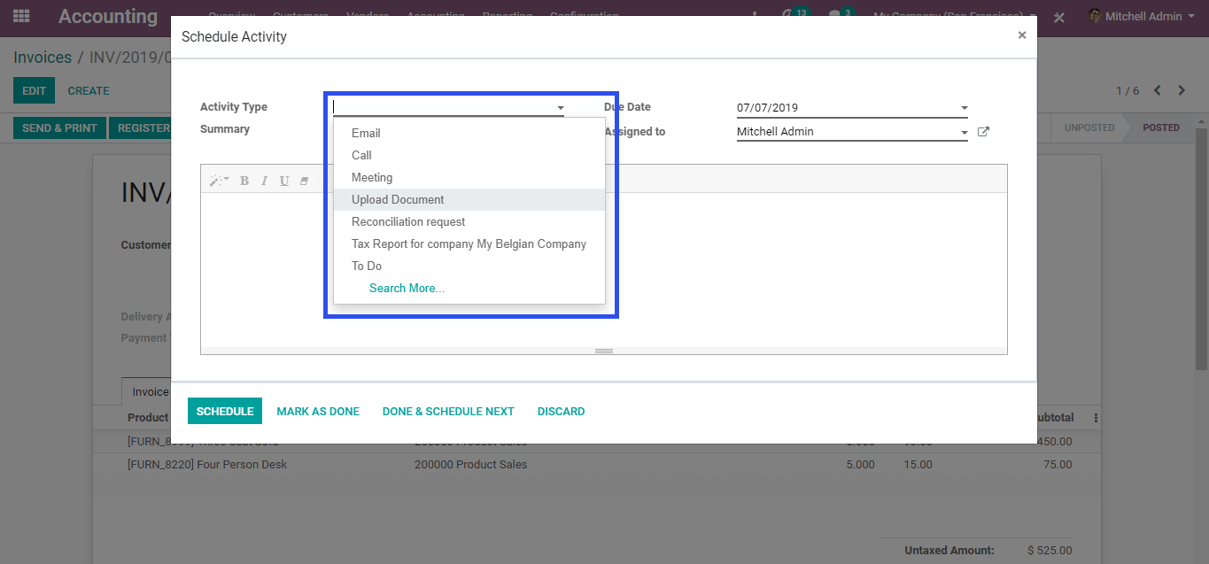 You can use newly added activity types and requests when scheduling an activity, such as 'Upload Document'